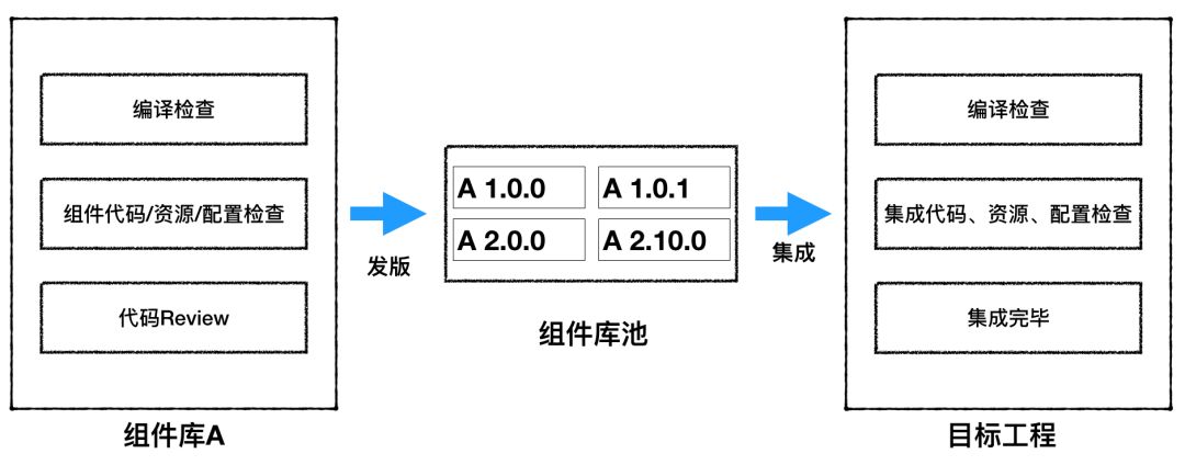 一次完整的组件集成流程包含两个阶段:组件库发版和向目标App工程集成。如下图所示: