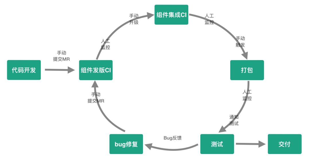 移动研发要完成一个完整功能需求,除了代码开发以外,需要经历组件发版、组件集成、打包、测试。如果测试发现Bug需要进行修复,然后再次经历组件发版、组件集成、打包、测试,直到测试通过交付产品。研发同学在整个过程中需要手动提交MR、手动升级组件、手动触发打包以及人工实时监控流程的状态,如此研发会被频繁打断来跟踪处理过程的衔接,势必严重影响开发专注度,降低研发生产力。