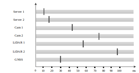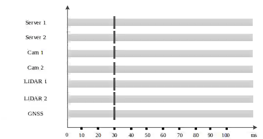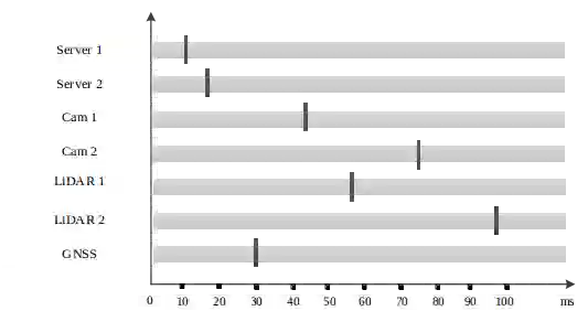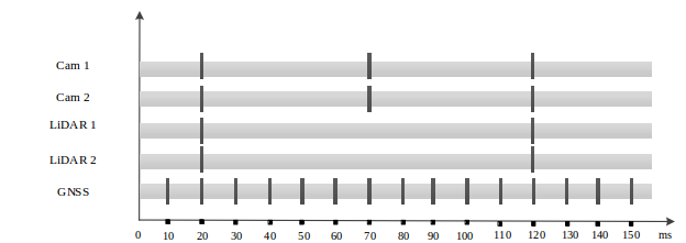 为了能够统一所有传感器的时间,一般可以将卫星时间作为所有传感器的时间源,同样处理器也使用卫星时间作为时间源。但如何实现呢?不同传感器有不同的特点,首先是处理器,处理器之间可以通过 NTP 进行时间同步,处理器和卫星的同步可以通过PPS实现。对于相机往往内部会有一个时钟,通过内部时钟,是可以对传输耗时进行补偿的,然后通过处理器时间和补偿时间,可以推算出实际的曝光时间。如果相机自身支持 PTP 或其他时间同步协议,则让其与对应的服务自协商进行精密时间同步即可。对于激光雷达,大多数都支持 PPS 时间同步,只要给他提供稳定的 PPS 信号即可。而 PPS 信号是可以由组合导航产生的,这往往是其最基本的功能,很容易实现。这样,所有传感器的时间就都统一为卫星时间了,时间的高精度统一,对于编队行驶尤其重要。有了时间同步的基础,就可以实现同步触发了。