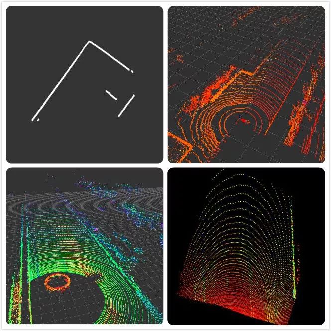 不同激光雷达输出效果比对,从左至右,从上至下:单线、64线、128线、固态