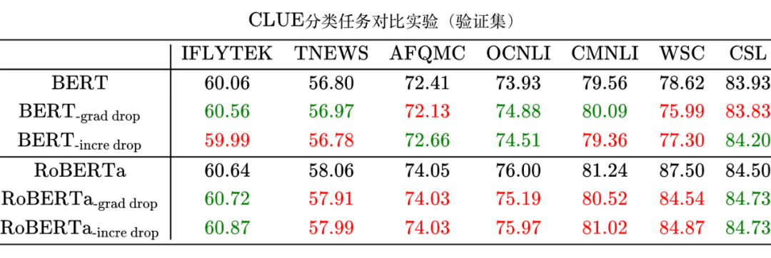 这里笔者在 CLUE 的几个任务上做了测试,结果如下表。其中,baseline 代码来自《bert4keras 在手,baseline 我有:CLUE 基准代码》,“grad drop”是对梯度进行 Dropout,“incre drop”是对更新量进行 Dropout,绿色表示相比 baseline 有提升,红色则表示下降。时间算力都有限,所有结果都只跑了一次,存在一定的随机波动。