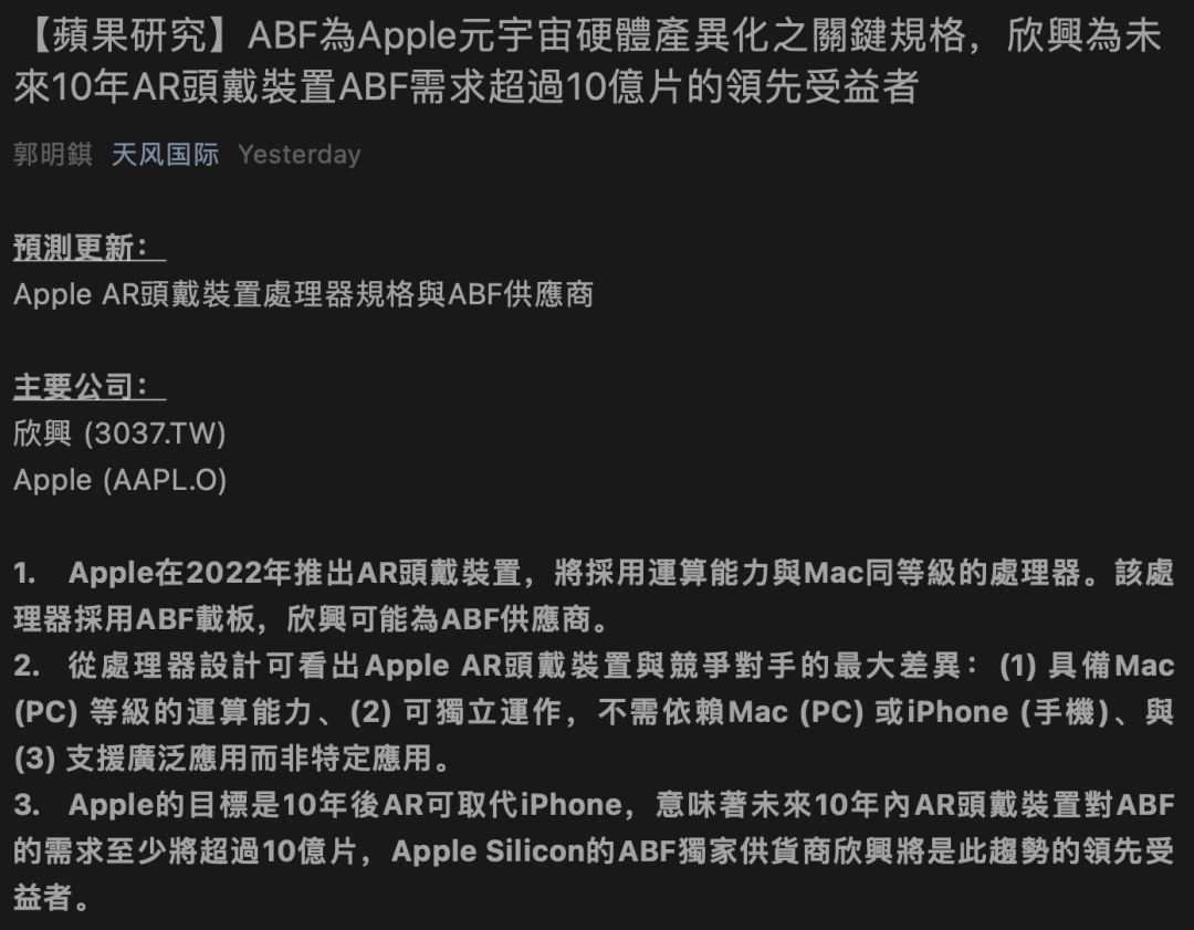 简单总结一下报告内容,此次郭明錤对苹果未来的这款AR头戴式设备的大致预测是: