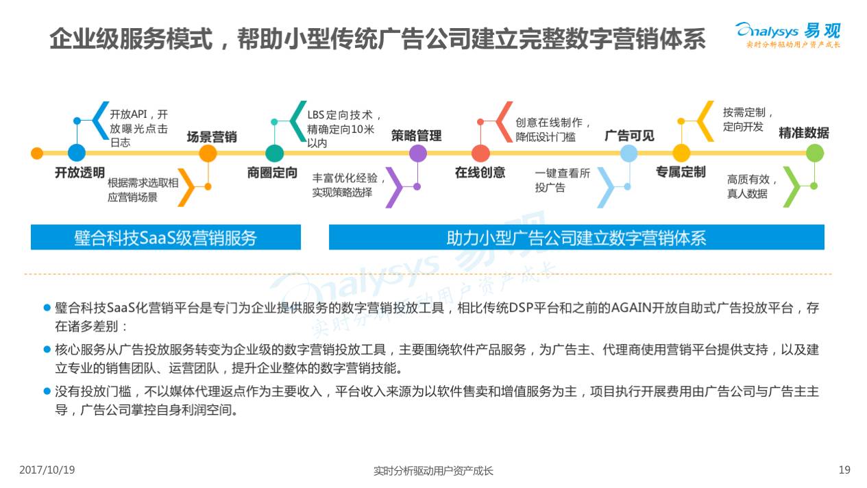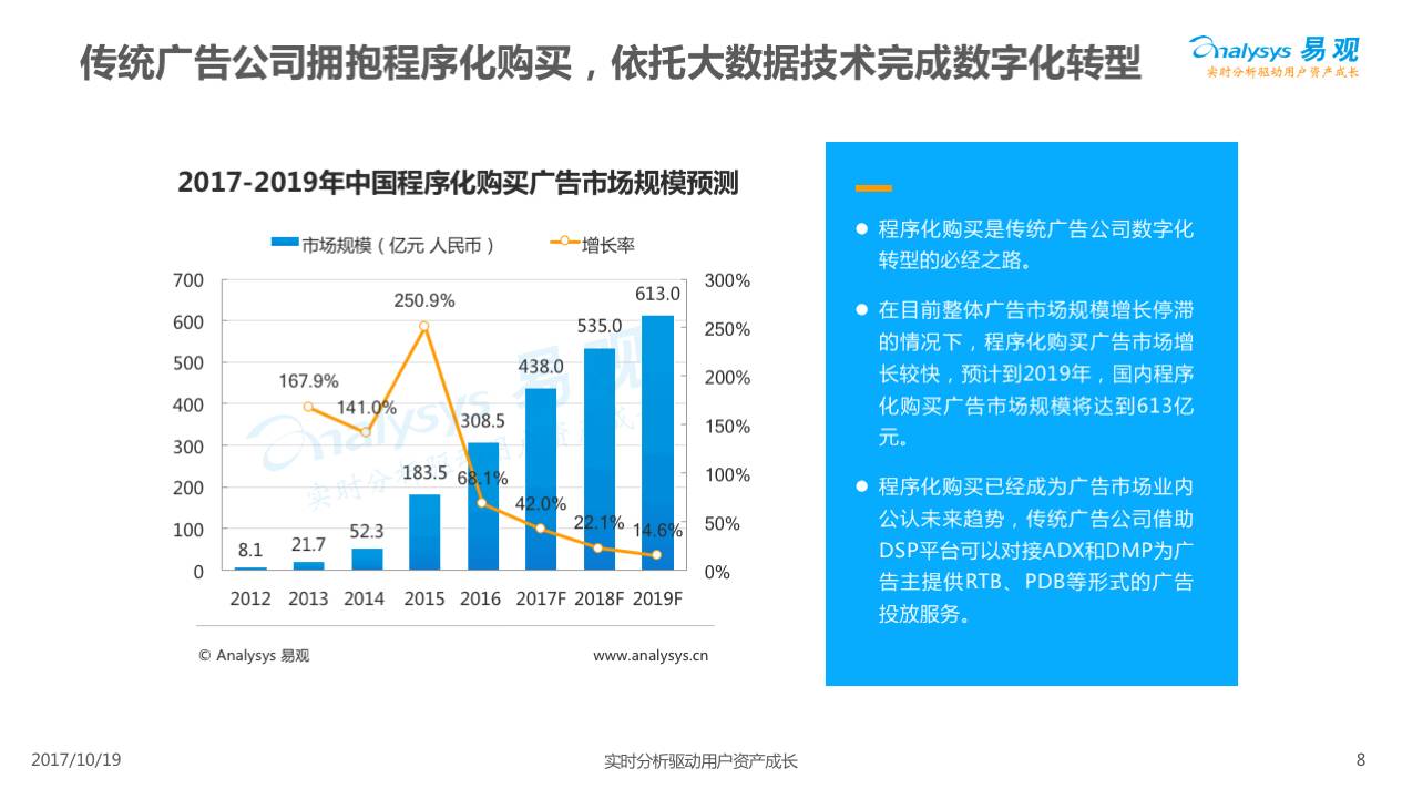 易观发布了《传统广告公司数字化转型白皮书2017》,分析认为在目前数字化高速发展的今天,传统广告公司需要加速拥抱程序化购买以实现数字化营销转型,分析对当前传统广告公司数字化转型现状和主要问题予以梳理,并以数字化转型服务商璧合科技为案例进行分析。