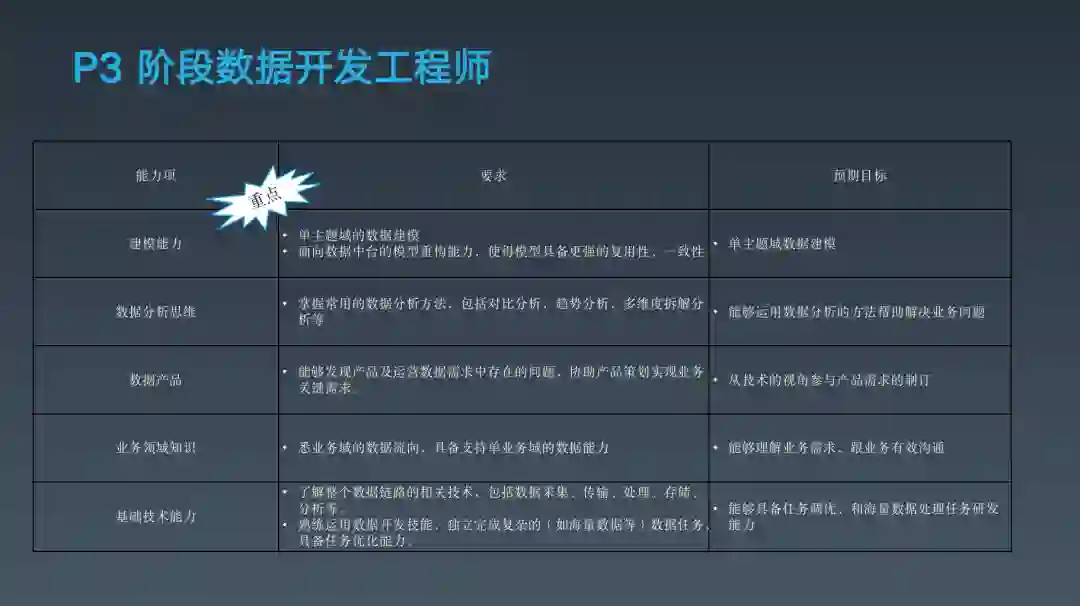 下面这是其中一位大佬梳理的大数据开发工程师某个阶段的能力模型,看看你现在处在什么阶段。