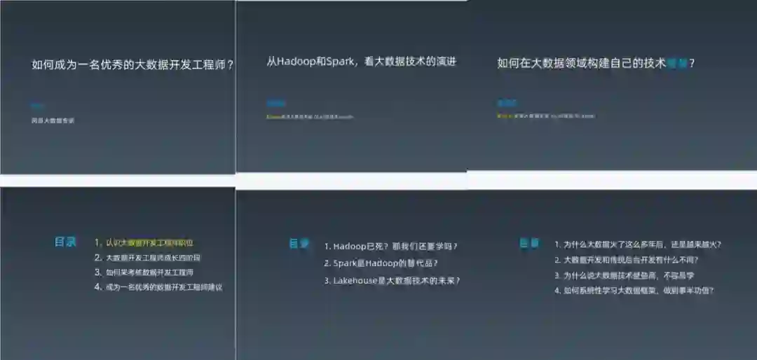二、来自网易、eBay 等大数据大佬的成长与职业规划课,都是他们的一手经验,对你日后的职场发展非常有价值。你可以照着大佬们给出的各个阶段的能力模型,查漏补缺,完善自己。