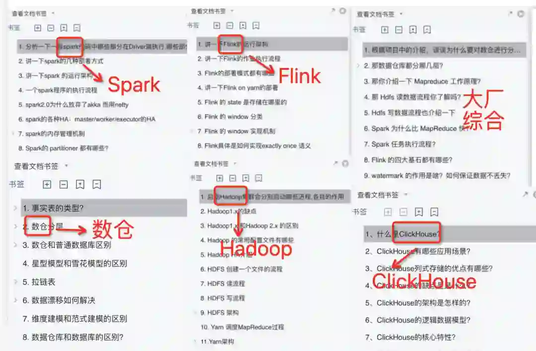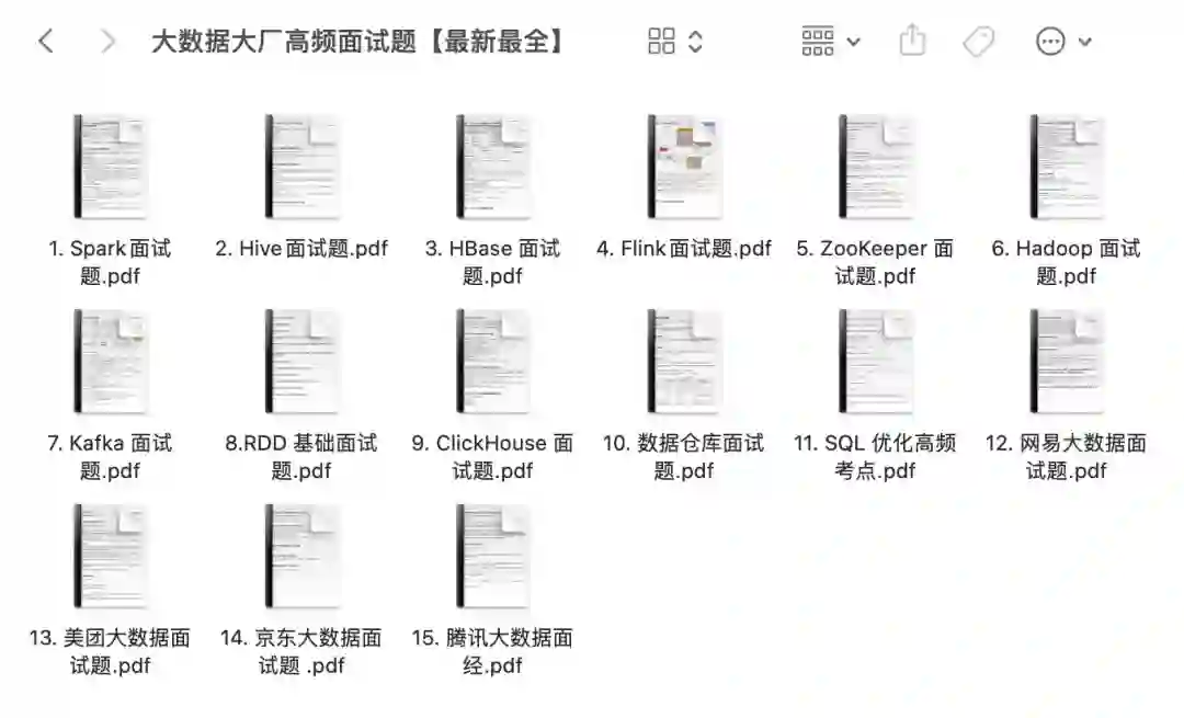这套大数据面试真题集,涵盖4大一线大厂真题+11大核心技术栈,Spark、SQL、RDD、Hive、HBase、Flink、Hadoop、Kafka、ZooKeeper、ClickHouse、数据仓库等全都囊括在内,还附加详细的答案解析。