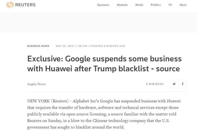 据路透社 20 日凌晨报道,在华为进入特普朗政府的黑名单后,Google 已暂停和华为的部分业务来往。