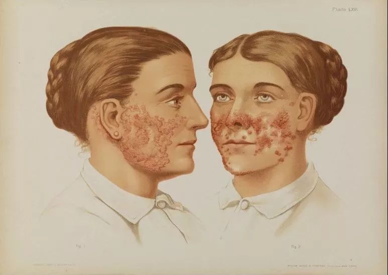 从Finsen对这种疾病的一次描述中,我们也可以深刻的感受到这种疾病的可怕性:“一团淡红色的团块周围环绕着两个粉红色的圆圈,呆滞的眼睛从眼眶里发出“死亡凝神”般的目光,他们没有鼻子,脸的最下面是一个有着颗粒状边缘且凹凸不平的洞,那就是他们唯一看上去可以呼吸的嘴巴”。