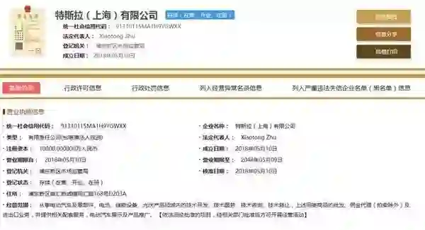 据国家企业信用信息公示系统,特斯拉(上海)有限公司于5月10日获上海浦东新区市场监管局核发的营业执照,特斯拉(上海)有限公司注册资本1亿元,股东为特斯拉汽车香港有限公司,公司成立日期为5月10日。