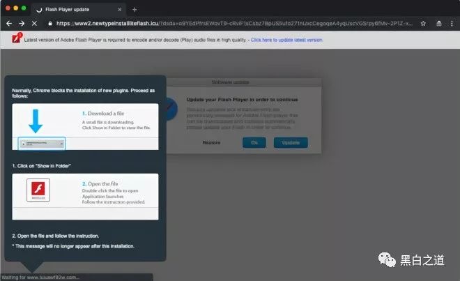 安全人员称,在1月11日到1月13日期间,一种名为“VeryMal”的恶意代码试图感染Mac电脑。这种恶意代码攻击采取了一种熟悉套路:在Mac电脑屏幕上显示Adobe Flash Player需要更新的通知,并敦促用户打开一个试图在浏览器中下载的文件;一旦用户点击下载并运行恶意软件,最终将导致Shlayer木马感染所用Mac电脑。