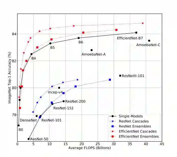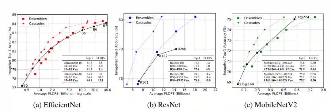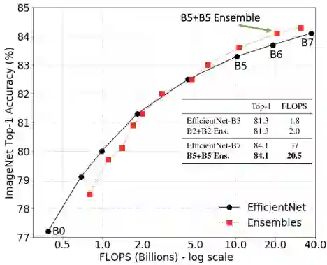 例如,两个EfficientNet-B5模型的集成可以匹配单个EfficientNet-B7模型的精度,但是使用大约50%的FLOPS。