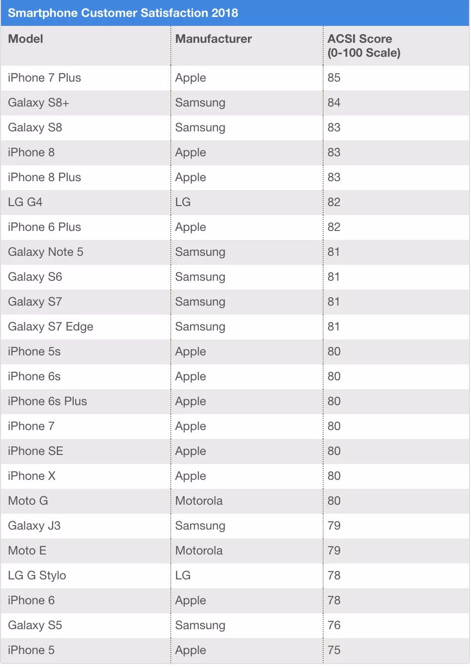 虽然iPhone X被消费者诟病稳定性不佳,还有Face ID的卖点,但iPhone XS呢?根据美国客户满意度指数(ACSI)发布的2018年智能手机报告,iPhone的客户满意度在下滑。最高分是iPhone 7P(85分),iPhone 8考分低了2分,到了iPhone X只有80分,和iPhone SE等机型持平。