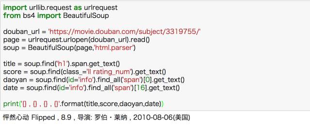 当然 BeautifulSoup 中的基本方法是不能忽略的,但也无非是 find、get_text() 之类,信息量很小。就这样,通过别人的思路和自己查找美丽汤的用法,完成了豆瓣电影的基本信息爬取。