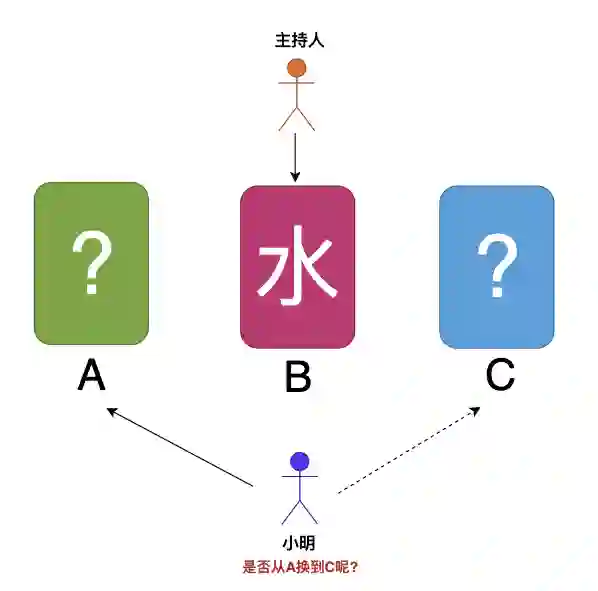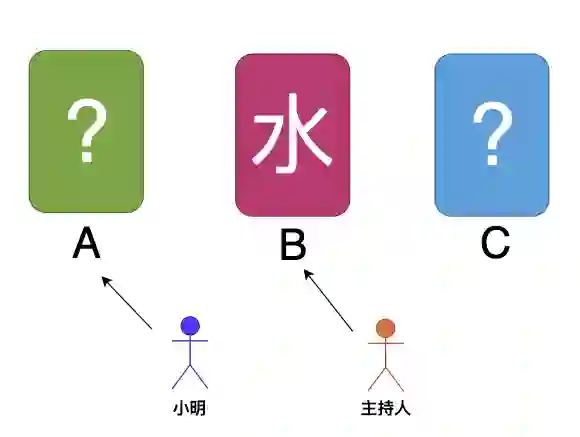 小明选中了A门,主持人选中了B门,并且开启B门后是矿泉水。