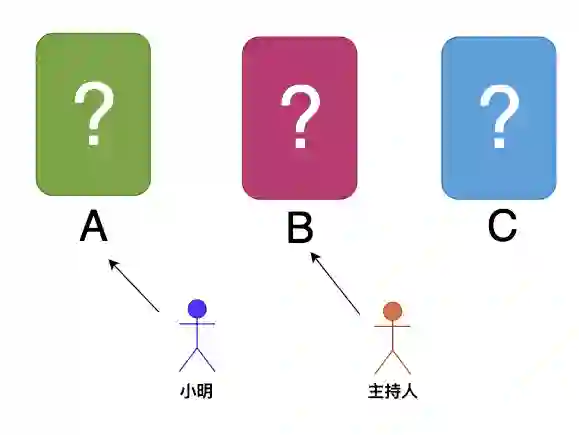 小明面前有ABC三扇相同的门,小明和观众无法知道ABC三扇门背后有什么。