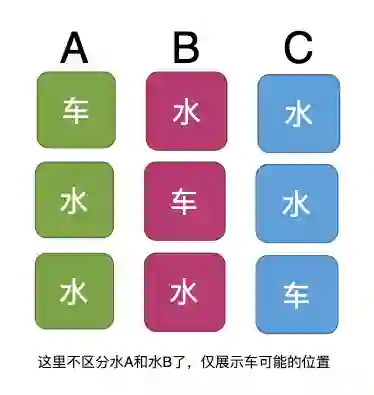 ABC三扇门中只有一扇门背后有一辆汽车,其他两扇门背后都是一瓶矿泉水。