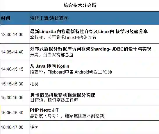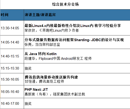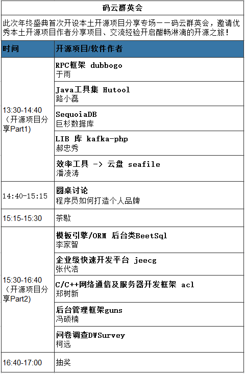 作为开源中国一年一度举办的开发者盛会,年终盛典的主题,为大家从今年以来开源软件技术的众多主题中选取出来的精华,为开发者打造一场酣畅淋漓的纯技术分享盛典。除了上午主会场共探本年度开源焦点,更有下午四大分会场:综合技术分会场、PostgreSQL分会场、码云群英会、视频2046分会场,带您领略不一般的开源技术之美,大会最终版日程如下: