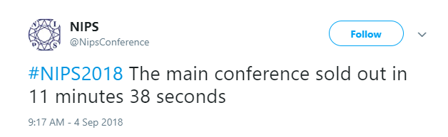 NIPS 2018 将于 12 月 3-8 日在加拿大蒙特利尔会展中心举办,按照会议安排,主办方于 9 月 4 日 8 点开放注册。但疯狂的是,主会议门票在 11 分 38 秒内 Sold out,刷新了去年 10 天内门票售罄的记录。而半小时后,tutorial 和 workshop 的票也全部 Sold Out。