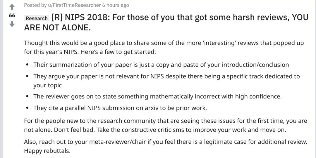 最后,正因为评审人员的标准降低,以及他们需要花更多的精力审议更多的论文,因此在评审结果出来后,很多研究者对论文的评分并不满意。在 Reddit 上很多讨论 NIPS 2018 评审结果的帖子可谓哀声一片。