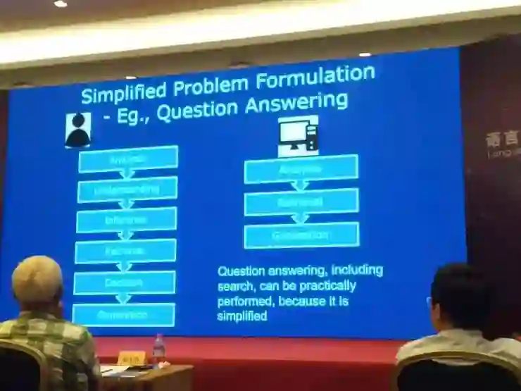 但是,我们现在要用计算机来做这种智能问答或者知识问答的时候,其实我们大幅度地简化了这个过程。就是只做分析、检索和生成。今天大会里面有很多老师做报告,介绍自然语言处理相关的技术,基本上做问答的时候,都是把这个问答的过程简化。