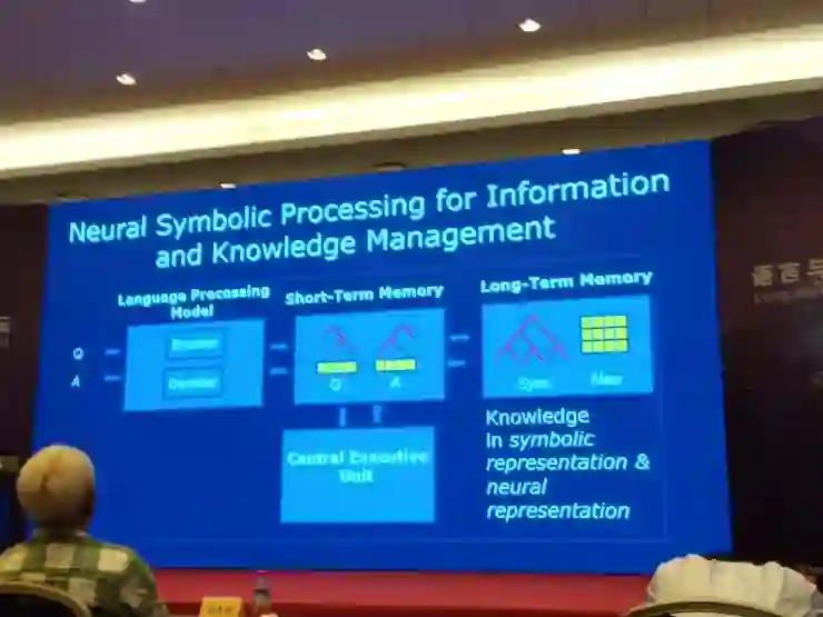 我们可以考虑用这样的技术,神经符号处理实现智能信息知识管理系统。就是说,你先来了一个问题,通过语言处理模块,它有编码器和解码器,编码器把这个问题转换成中间的表示,中间表示放在短期记忆里,这个问题是有两部分,既有符号表示又有神经表示。现在自然语言处理内,很多系统类似在做这样的事情,大家可能没有明确说这个事。