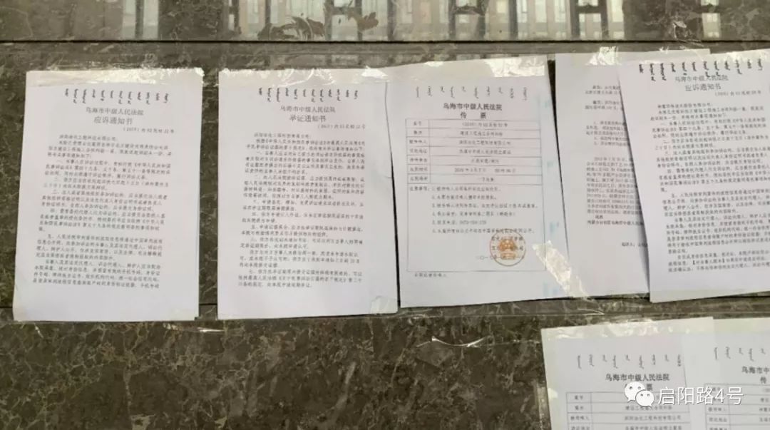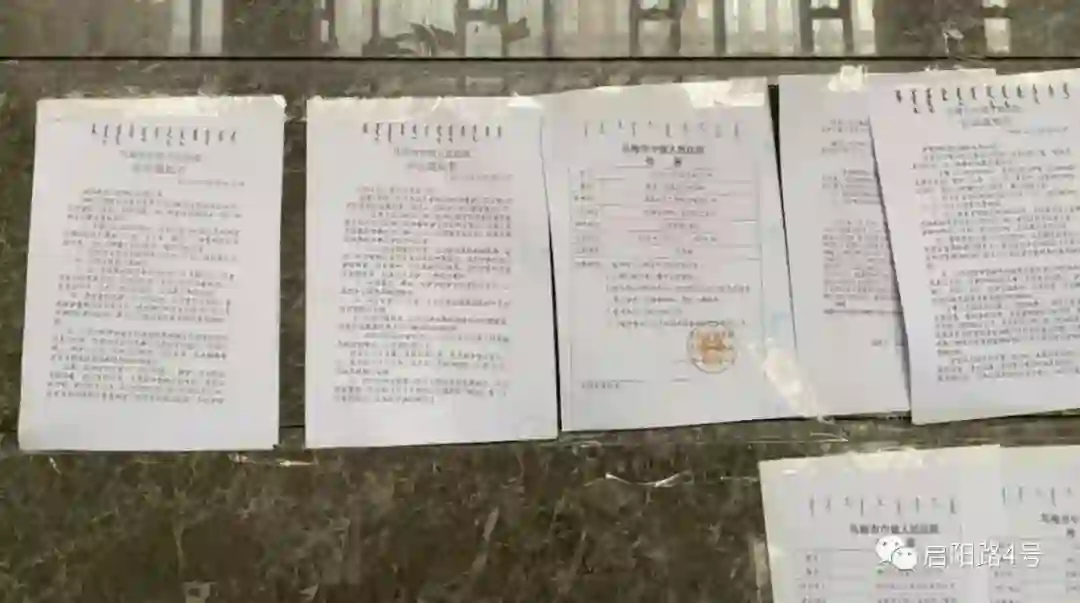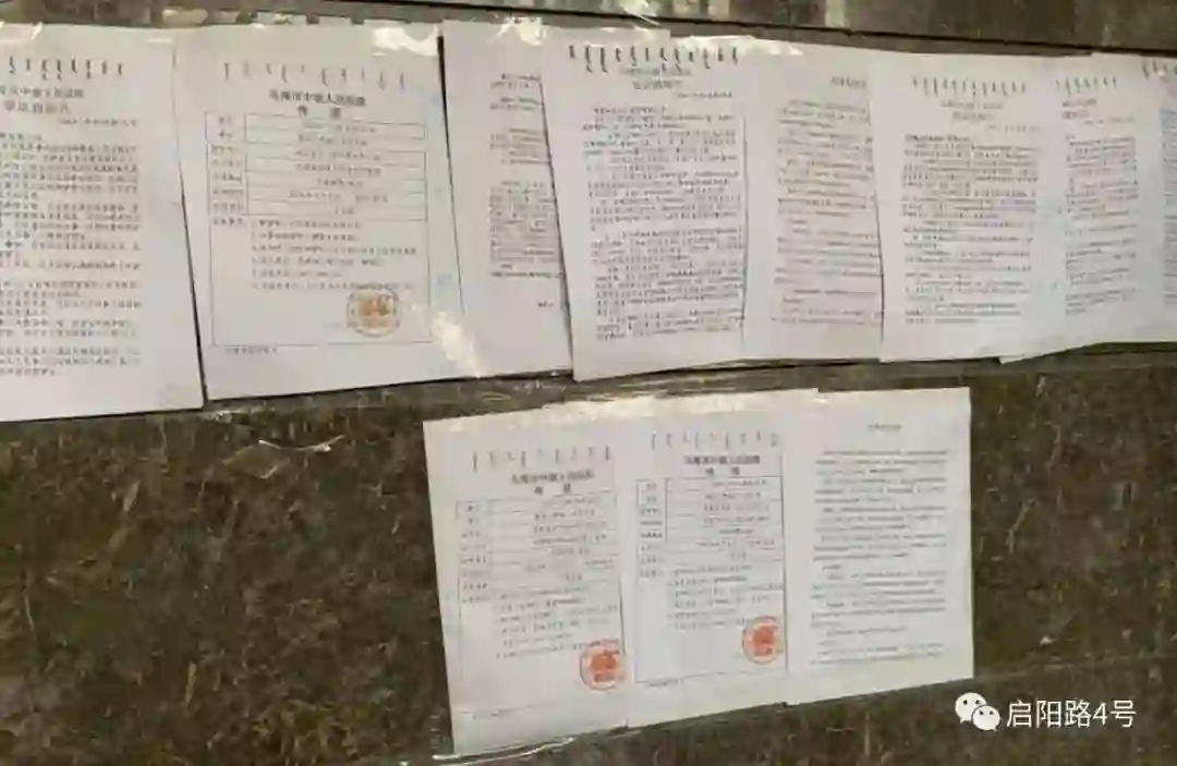 办公室一层入口处贴满了法院传票等|杨芳拍摄