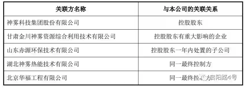这些关联方包括甘肃金川神雾资源综合利用技术有限公司、神雾科技集团 股份有限公司、湖北神雾热能技术有限公司、北京华福工程 有限公司和湖北神雾热能技术有限公司。