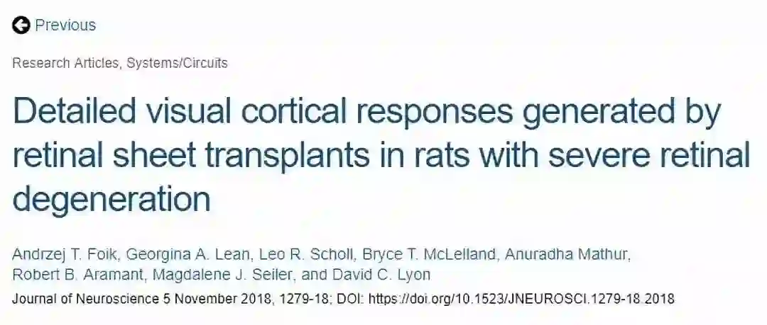 Lyon及其同事通过测量初级视觉皮层神经元的反应,证明了接受供体细胞的严重视网膜变性大鼠在术后三个月就对视觉刺激的各种属性变得敏感,包括大小、方向和对比度。