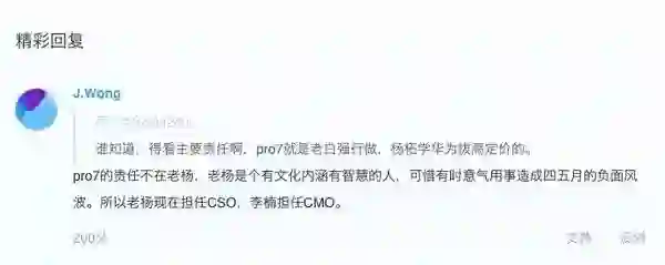 黄章也在论坛上说明,pro7的责任不在老杨(杨柘),老杨是个有文化内涵有智慧的人,可惜有时意气用事造成四五月的负面风波。所以老杨现在担任CSO,李楠担任CMO。