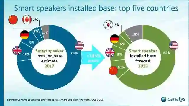 按地区划分,美国目前是全球智能音箱的最大市场,截至2017年底的市场份额约为73%。Canalys预计,今年年底美国的市场份额将跌至64%。截至去年年底,中国的智能音箱市场份额约为3%,但今年将增加到10%。