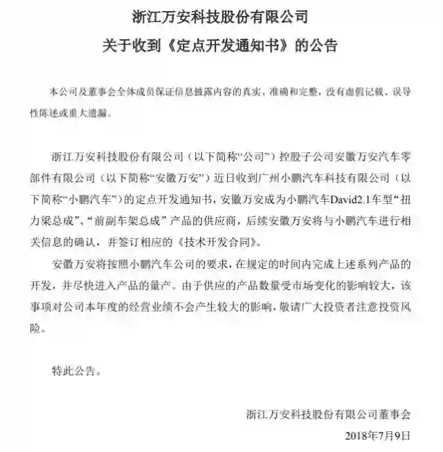 万安科技7月9日晚间公告,控股子公司安徽万安成为小鹏汽车David2.1车型“扭力梁总成”、“前副车架总成”产品的供应商,后续安徽万安将与小鹏汽车进行相关信息的确认,并签订相应的《技术开发合同》。