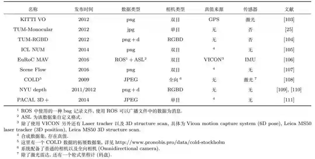 基于深度学习的方法要解决的一个基本问题是如何得到训练使用的大规模数据集合,KITTI(Karlsruhe institute of technology and Toyota technological institute)和TUM(Technische Universitat Munchen)数据集中除了图像序列,还给出了图像的深度和相机采集图像时的位姿。如果不存在VICON或高精度IMU等数据作为真值,只有单纯图像序列的数据集,可以使用SFM(Structure from motion)方法计算每一帧图像的对应相机运动参数。