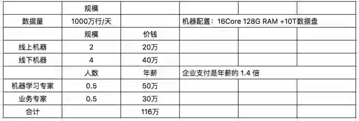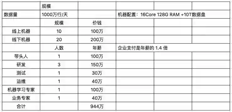 1000 万行/天的数据规模,机器学习系统一年的支出是 944 万。