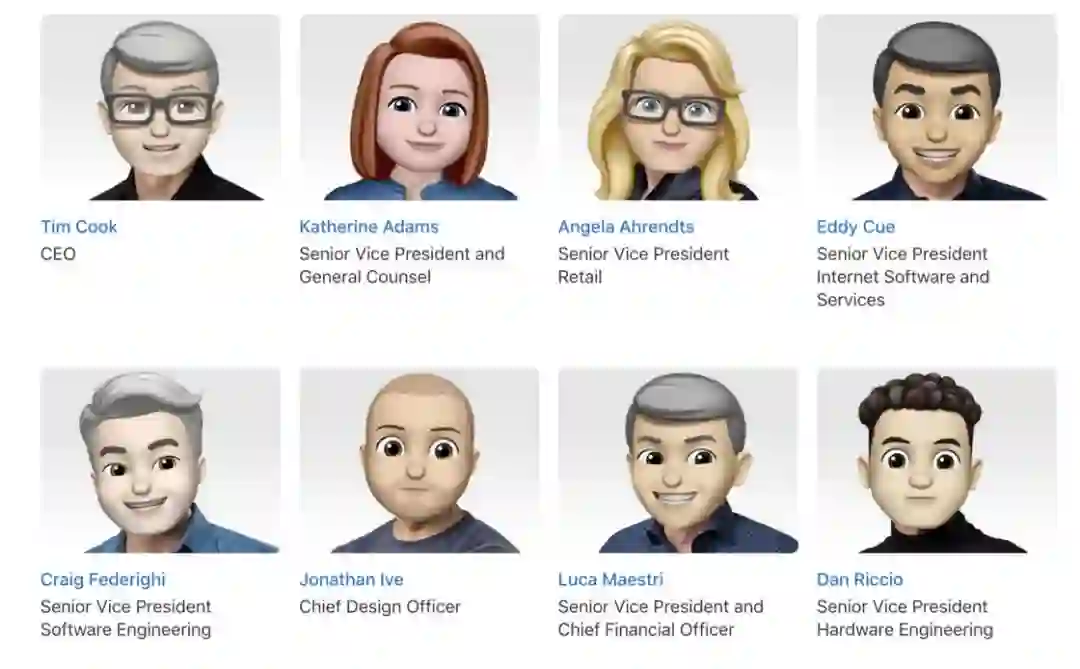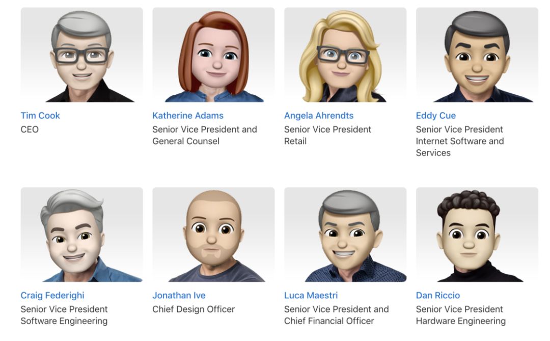 此外,为了宣传在 iOS 12 中新加入的 Memoji 功能,苹果将 高管介绍页 的照片换成了 Memoji 头像。来源