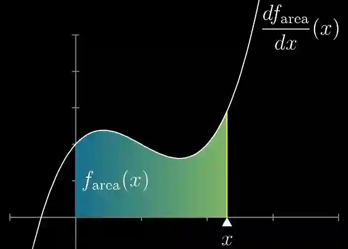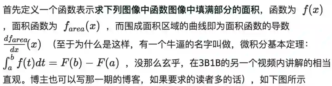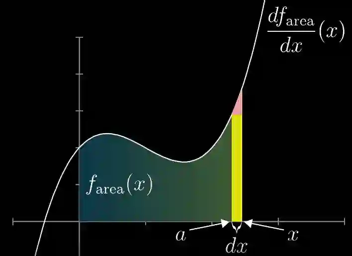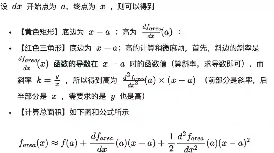 定义一个这样的场景是为了计算这样一件事(如下图所示):假设我们知道了f(a)点的面积,往右扩展很小的距离dx要算出新部分的面积(左边绿色已知 + 黄色矩形 + 红色三角形),公式会是什么样的呢?