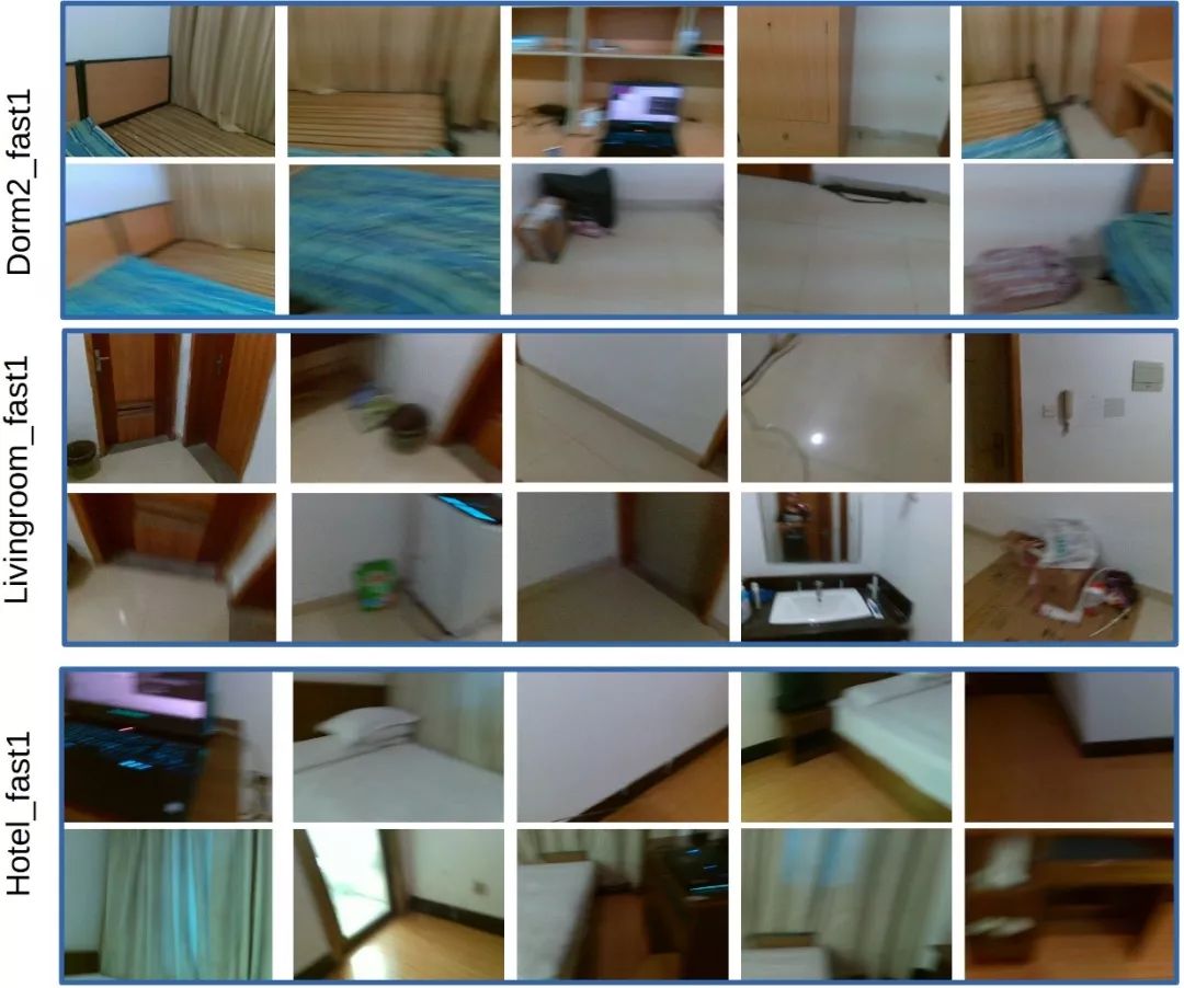 数据集共有从6个不同场景中采集的14个视频序列.所有序列依据相机运动速度及彩色图像的模糊程度被区分为慢速,中速和快速。以下是数据集中部分场景的图片: