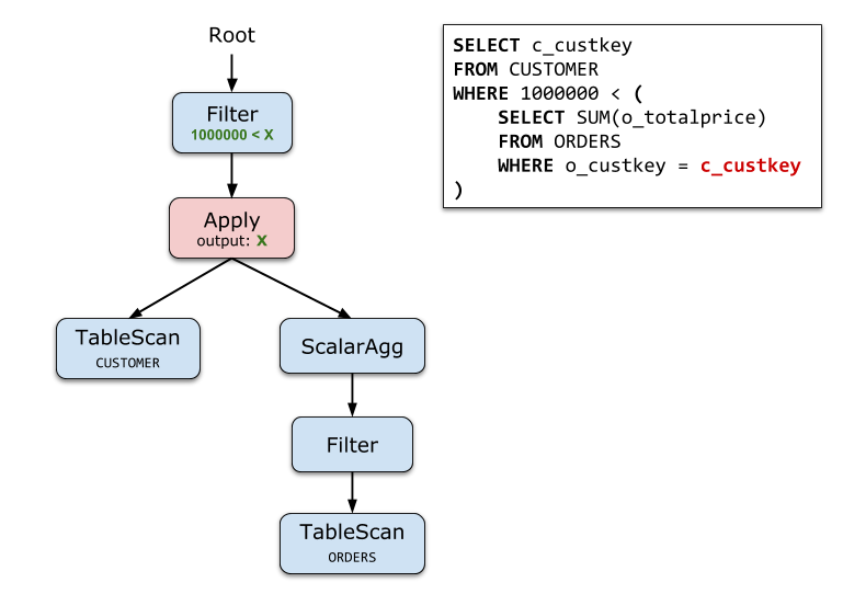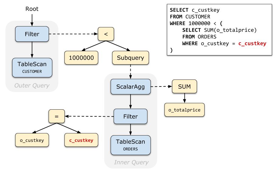 我们以 Query 1 为例,直观地感受一下,为什么说关联子查询的去关联化是十分必要的。