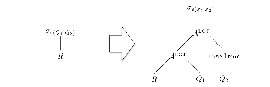 如果某个算子的表达式中出现了子查询,我们就把这个子查询提取到该算子下面(留下一个子查询的结果变量),构成一个 算子。如果不止一个子查询,则会产生多个 。必要的时候加上 算子。