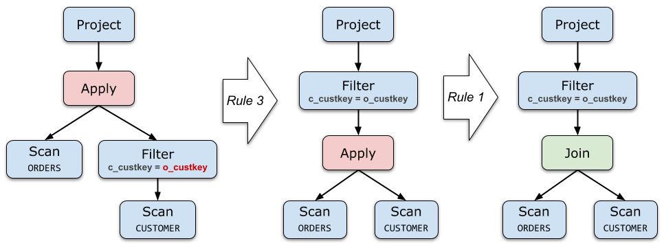 上文说到的 Relation - Expression - Relation 这种交替引用不仅执行性能堪忧,而且,对于优化器也是个麻烦的存在——我们的优化规则都是在匹配并且对 Relation 进行变换,而这里的子查询却藏在 Expression 里,令人无从下手。