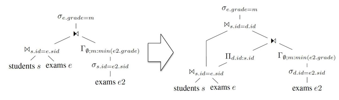 下面是对 Query 2 应用规则 (3) 的例子。之后再应用规则 (1),就完成了去关联化过程。