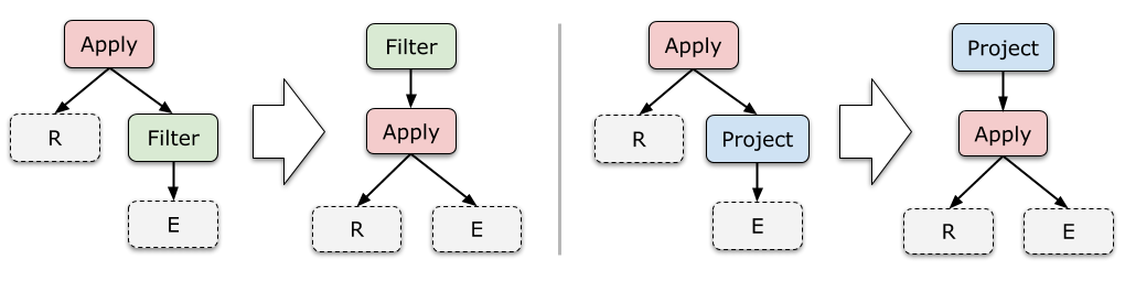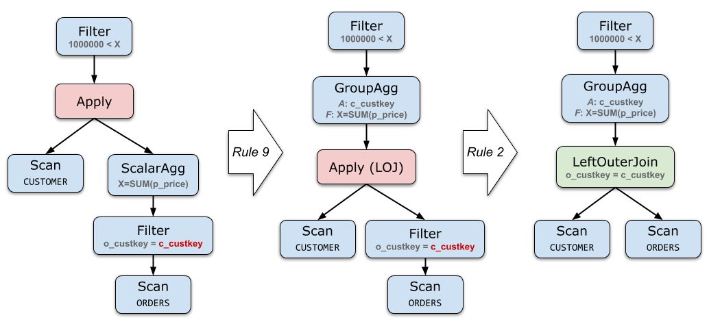 我们稍后就会看到这样做的巨大收益:当 Apply 被推最下面时,就可以应用第一组规则,直接把 Apply 变成 Join,也就完成了子查询去关联化的优化过程。