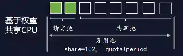 基于权重的共享CPU管理方式让离线应用可以复用所有空闲资源,同时调低离线任务的权重来降低对在线CPU资源的抢占,并采用quota与period结合的形式来限制离线业务对资源的使用。