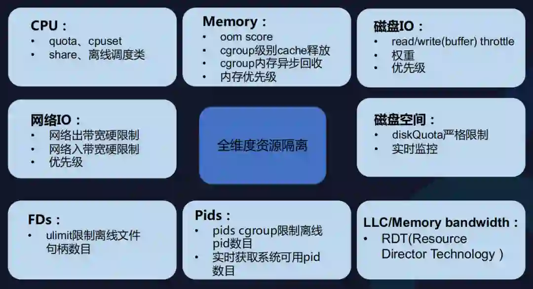 资源隔离是混部的基础,全维度资源隔离能够避免离线在单一维度上的资源挤占对在线造成影响。