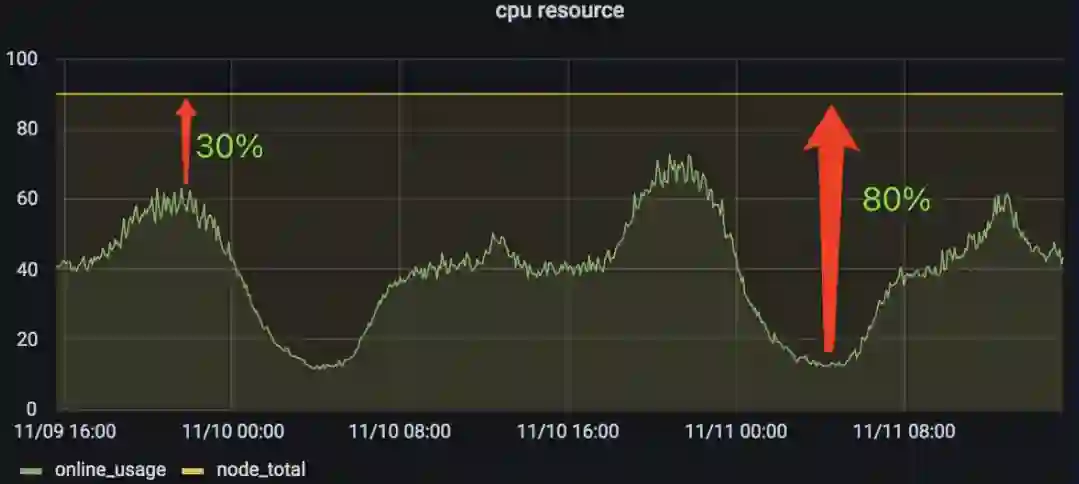 上图是某一在线CPU的使用曲线,在这里可以看出,在线资源使用的潮汐现象十分明显。业务方在申请资源时只能按照波峰时段的资源使用量进行申请,这就导致在波谷时段会有大量资源被浪费。