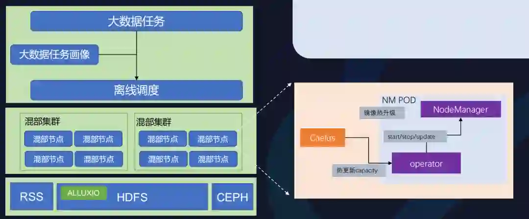 为了保证NM在容器中稳定地运行,我们也做了很多优化。如镜像热升级功能可以保证容器中的离线任务在NM Pod升级过程中继续保持运行。另外混部资源是动态变化的,所以RM(Resource Manager)端的资源也需要动态感知,热更新capacity功能可以在不重启NM进程的情况下,动态地更新NM在RM端的资源,从而减少因重启带来的资源开销。