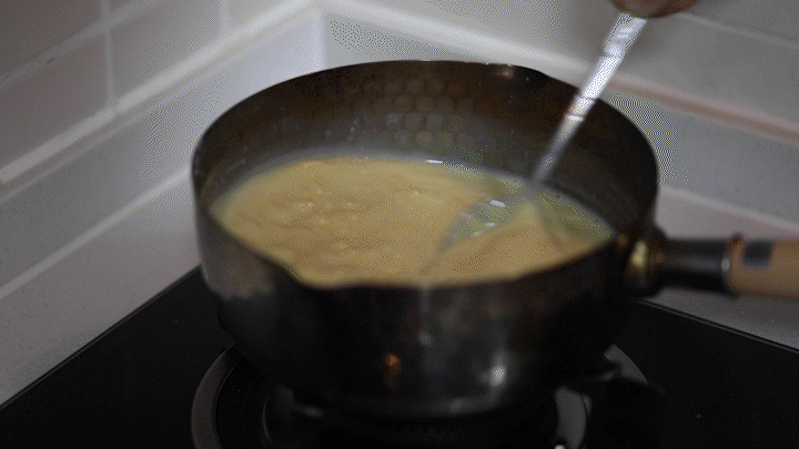 1. 500g牛奶,20g糖,50g玉米淀粉,一片芝士片,两个蛋黄倒入锅中
