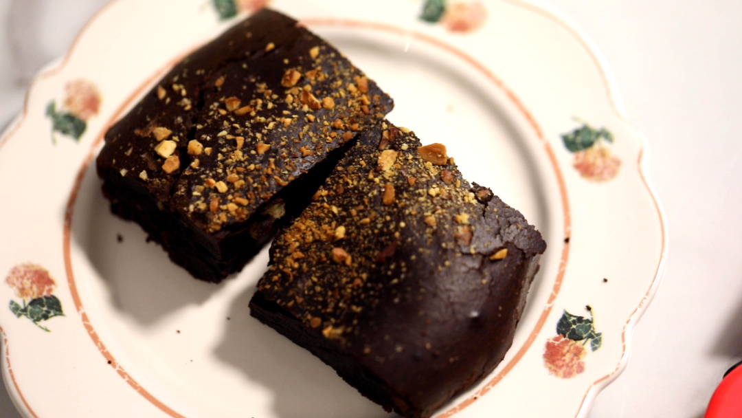 经过一系列的工序之后,终于到了见证奇迹的时刻!品尝以后,王哥发现了两个问题:第一个问题就是原攻略里并没有标明用什么类型的黑巧。我们使用的是85%黑巧克力,导致最后布朗尼不够甜。
