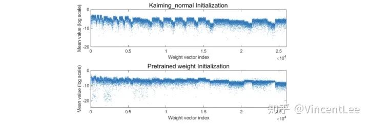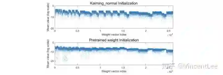 对ResNet50的不同初始权值进行可视化,可以看到权值都非常小(小于 ),这说明如果使用GC来训练,输出特征不会对输入特征的变化过于敏感。这个属性正则化输出特征空间,并且提升网络训练的泛化能力。