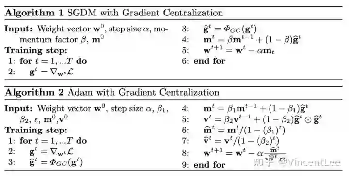 GC能够简单地嵌入当前的主流网络优化算法中,如SGDM和Adam,直接使用零均值化的梯度 进行权值的更新。