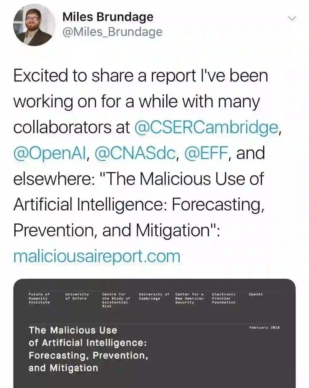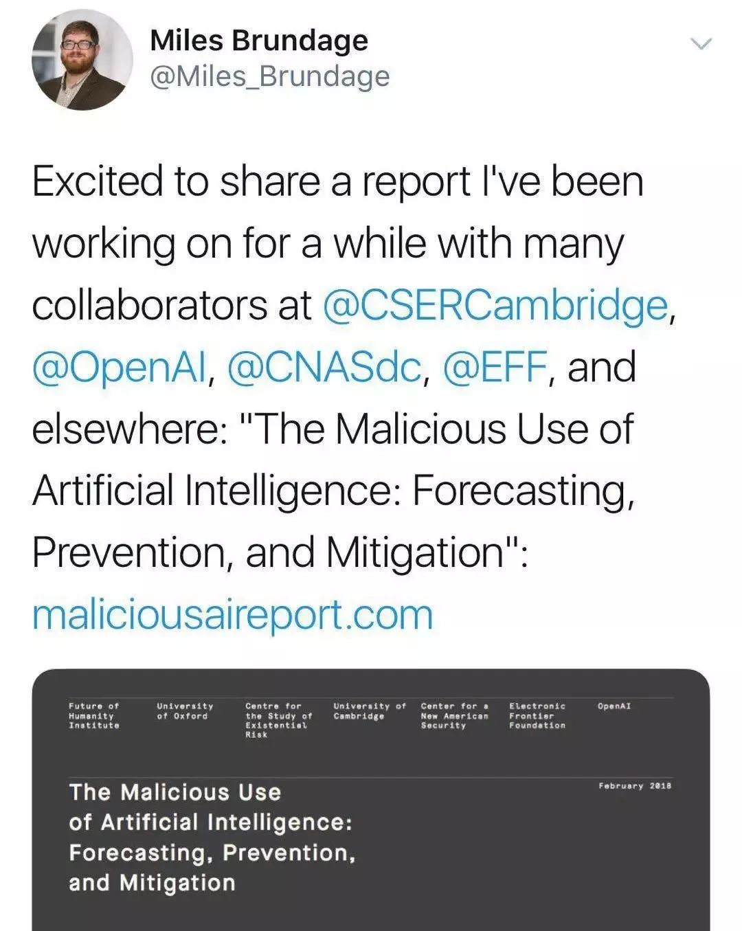 报告作者之一、来自牛津大学人类未来研究所的Miles Brundage在推特上发布报告